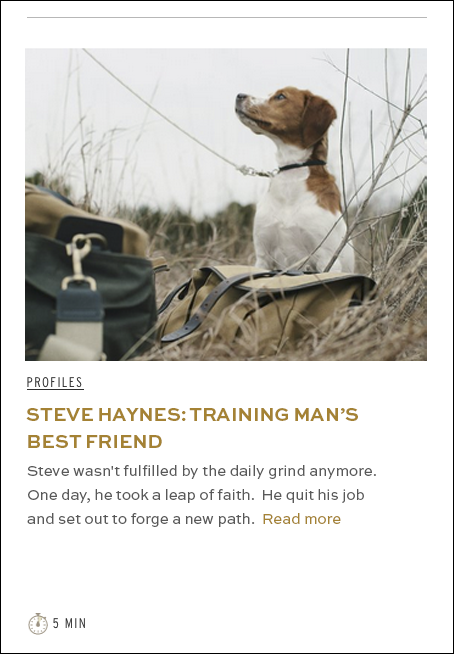 The Filson Journal is designed to showcase real customers and the way they use Filson products in their lives. I art directed this story on Steve Haynes, a hunting dog trainer working, in collaboration with photographer Bill Sallans.
