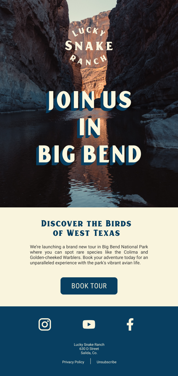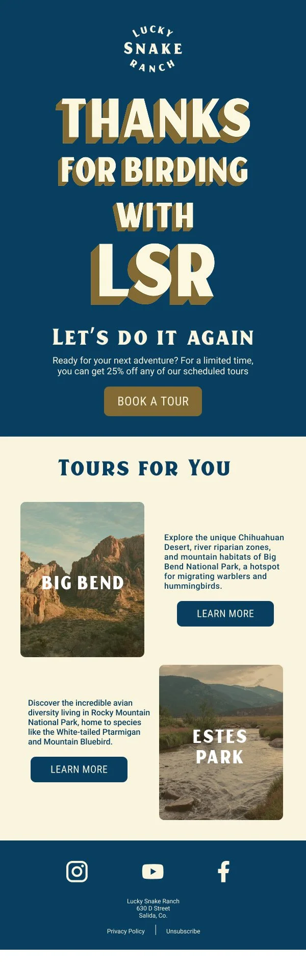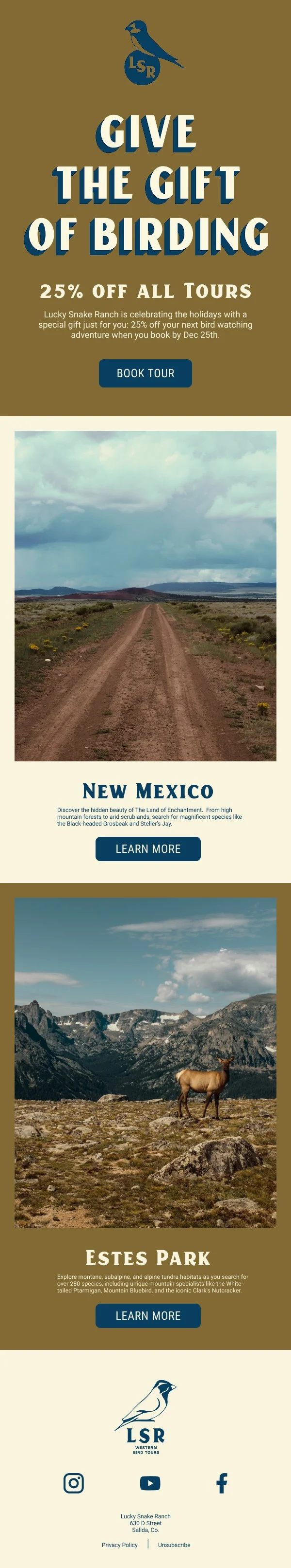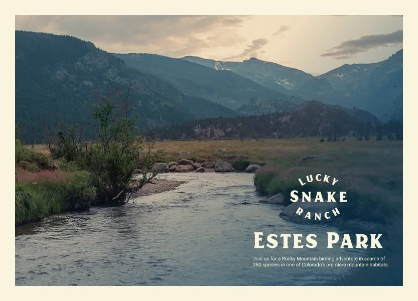 Logo design, messaging, email, and print design for Lucky Snake Ranch, a bird watching tour company based in the Western United States.